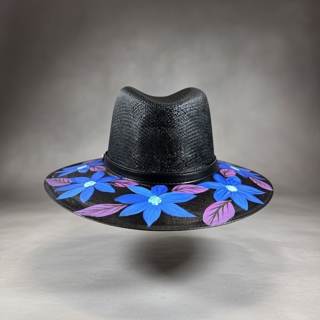 This Fedora is a hand-painted palm-straw hat, showcasing a stunning composition of purple flowers that seem to come to life under the sun. Each design is painted by skilled Mexican artisans using vibrant acrylic tones, — inspired by the harmony between sky, flora, and freedom.