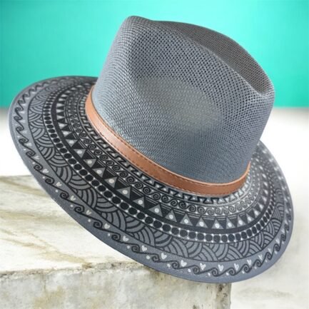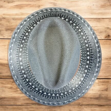 This Hand Painted Fedora Hat with grey and black accents is a stunning unisex accessory perfect for travel, parties, or casual outings. Made of handwoven palm straw with intricate detailed patterns, this lightweight hat exudes a unique Mexican flair. The detailed design and handmade craftsmanship make it a standout piece for those who appreciate a blend of traditional and modern styles. Perfect for the summer, fall, and spring seasons, this Fedora hat in size L is a stylish and eye-catching addition to any wardrobe.