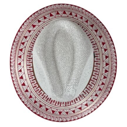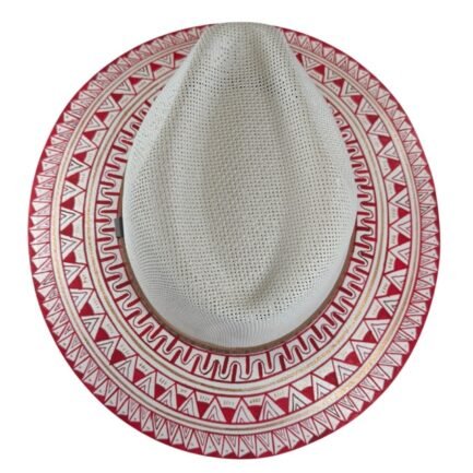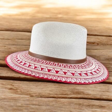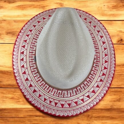 This Hand Painted Fedora Hat Red with golden accents is a stunning unisex accessory perfect for travel, parties, or casual outings. Made of handwoven palm straw with intricate detailed patterns, this lightweight hat exudes a unique Mexican flair. The detailed design and handmade craftsmanship make it a standout piece for those who appreciate a blend of traditional and modern styles. Perfect for the summer, fall, and spring seasons, this Fedora hat in size L is a stylish and eye-catching addition to any wardrobe.
