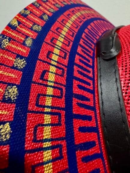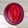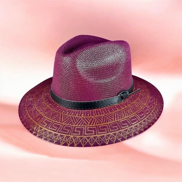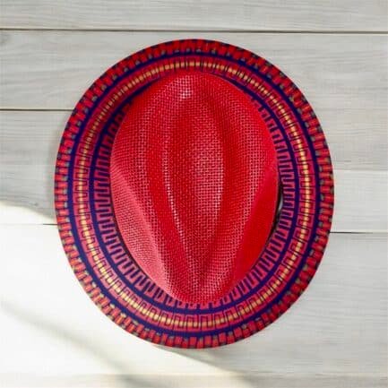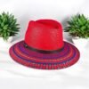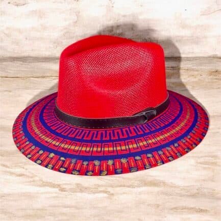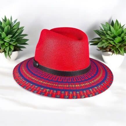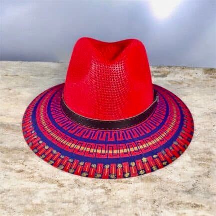 This Hand Painted Fedora Hat Red with golden and blue accents is a stunning unisex accessory perfect for travel, parties, or casual outings. Made of handwoven straw with intricate detailed patterns, this lightweight hat exudes a unique Mexican flair. The detailed design and handmade craftsmanship make it a standout piece for those who appreciate a blend of traditional and modern styles. Perfect for the summer, fall, and spring seasons, this Fedora hat in size L is a stylish and eye-catching addition to any wardrobe.