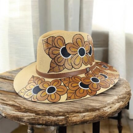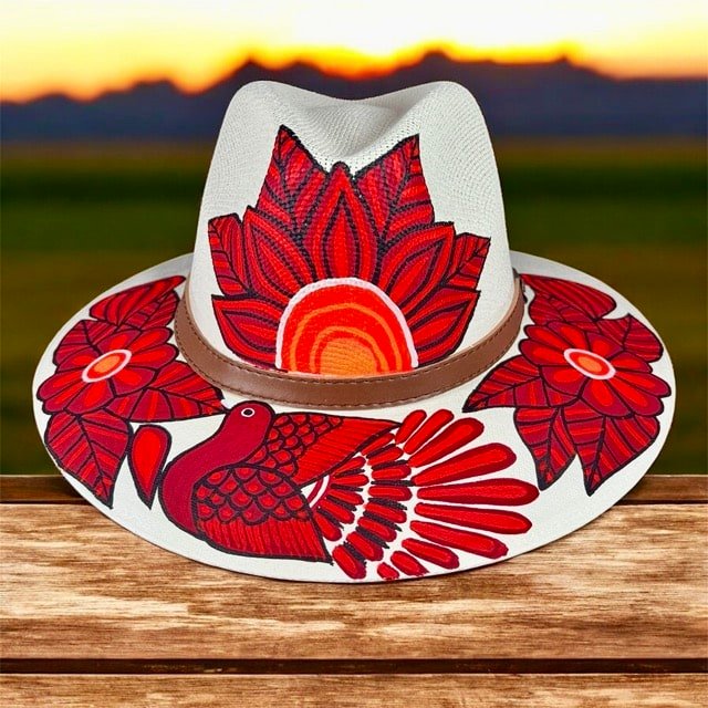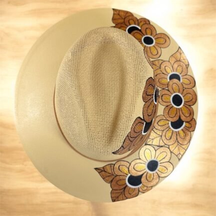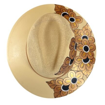 This Fedora is a hand-painted palm-straw hat, showcasing a stunning composition of  flowers that seem to come to life under the sun. Each design is painted by skilled Mexican artisans using vibrant acrylic tones in golden, black and white.