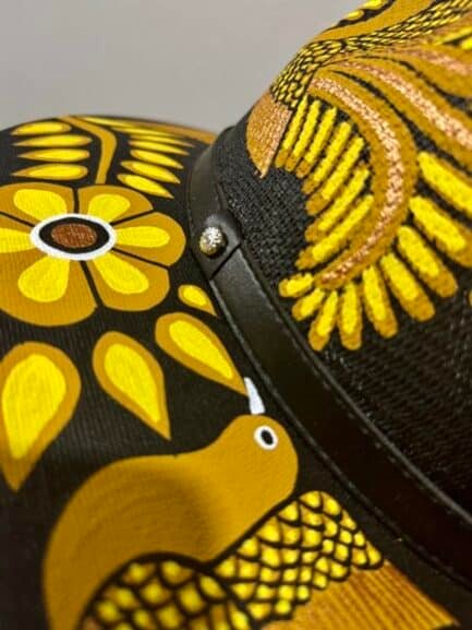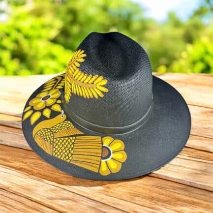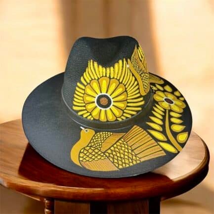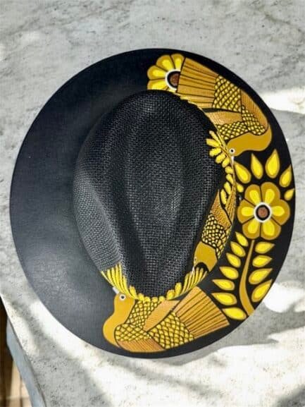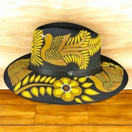 This Fedora is a hand-painted palm-straw hat, showcasing a stunning composition of birds and flowers that seem to come to life under the sun. Each design is painted by skilled Mexican artisans using vibrant acrylic tones in golden, black and yellows — inspired by the harmony between sky, flora, and freedom.