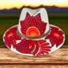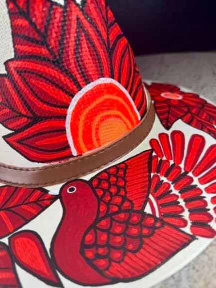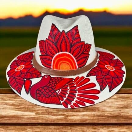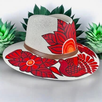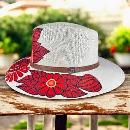This Fedora is a hand-painted palm-straw hat, showcasing a stunning composition of red flowers that seem to come to life under the sun. Each design is painted by skilled Mexican artisans using vibrant acrylic tones in red and black — inspired by the harmony between sky, flora, and freedom.