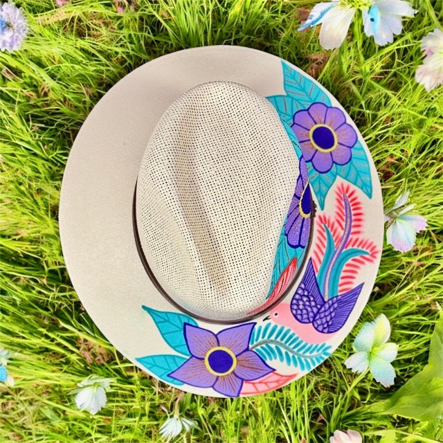 This Fedora is a hand-painted palm-straw hat, showcasing a stunning composition of birds and flowers that seem to come to life under the sun. Each design is painted by skilled Mexican artisans using vibrant acrylic tones in turquoise, coral, blue, and gold — inspired by the harmony between sky, flora, and freedom.