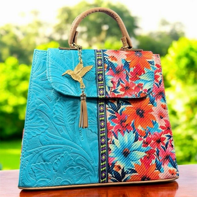 Material: Embossed synthetic goat leather with vibrant embroidered fabric